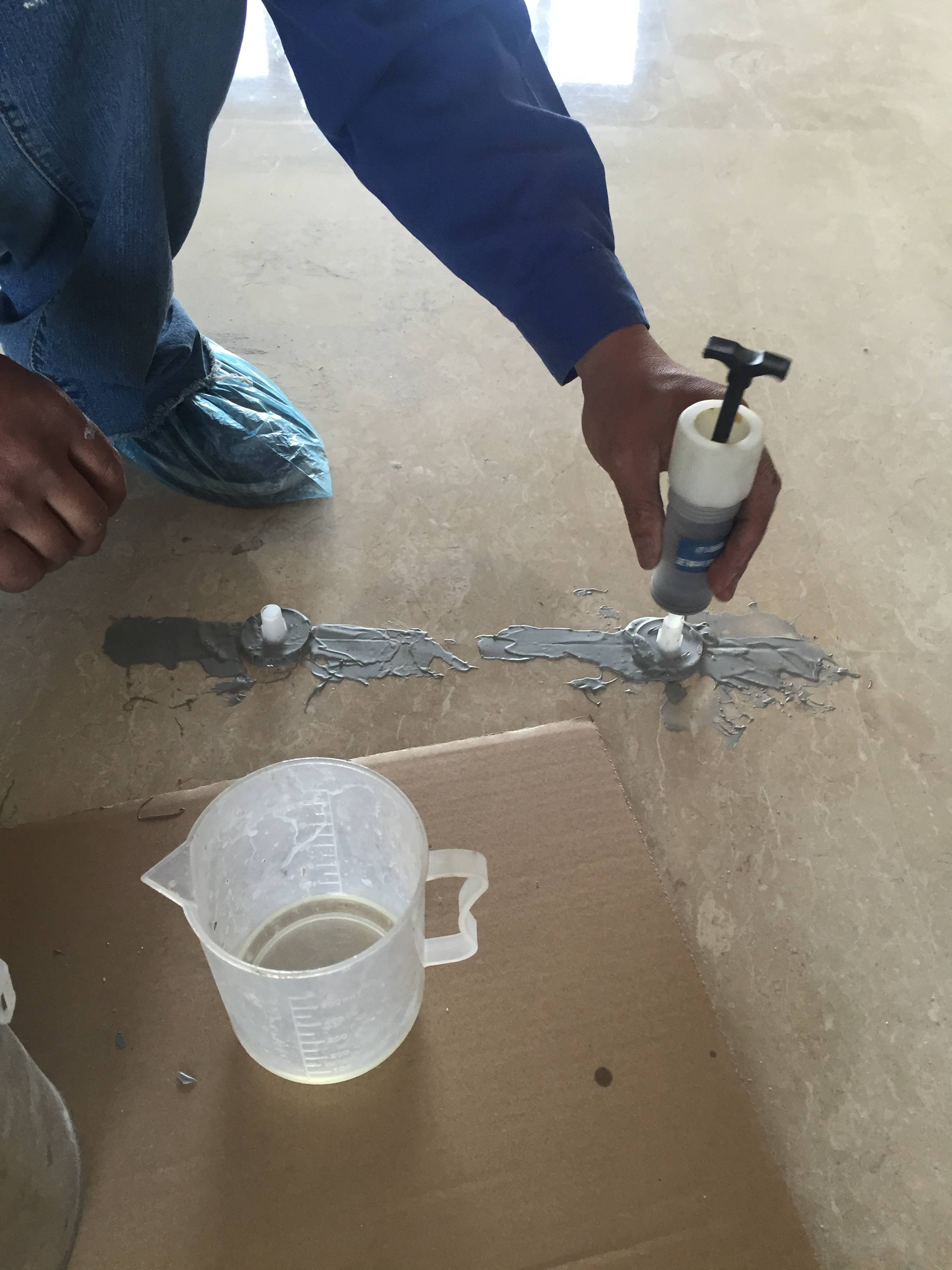 2、地砖空鼓灌浆有用,如果发现瓷砖边缘出现空鼓,可对边缘空鼓的部分进行浇灌处理将瓷砖之间缝隙用小铲子砸开,然后把班力仕环氧注射胶注射到缝隙里,空鼓地方会自动吸进去,直到灌满灌完凝固,避免整体更换墙地面的瓷砖出现少量的局部空鼓,如在不影响橱柜镜柜花洒和热水器等家具家电安装稳固的情况下。